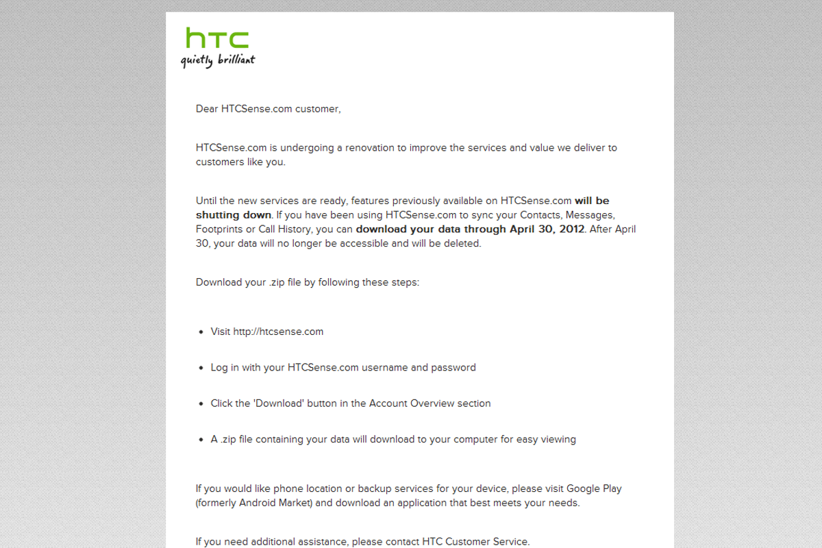 A HTC szűkszavú közleményben tudatta, hogy április 30-án lekapcsolja a HTCSense.com-ot, egyben kérte felhasználóit, hogy legkésőbb eddig az időpontig a virtuális tárhelyen lévő állományokról készítsenek mentést, mert a fájlok később már nem lesznek online hozzáférhetők. A hivatalos verzió szerint a HTCSense.com később új formában kel majd életre, azonban valószínűbbnek tűnik, hogy a gyártó a jövőben egyáltalán nem kíván ilyen jellegű szolgáltatást nyújtani, mert ezek többsége az Android Marketről letöltött programokkal pótolható – saját weboldalán a HTC is arra buzdítja a felhasználókat, hogy keressenek alternatívát a Google piacterén.