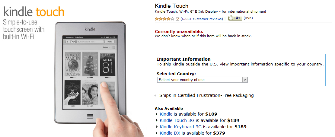 Az Amazon weboldalán pillanatnyilag nem lehet megrendelni a Kindle Touch WiFi-s és 3G-s változatát sem, és az Amazon azt sem közölte, hogy az e-bookokat mikor lehet majd újra megvásárolni. A legmerészebb tipp az lehet, hogy sosem; könnyen elképzelhető ugyanis, hogy a vállalat már a következő generációs készülékeknek készíti elő a terepet, így a Kindle Touch jelenlegi verzióját, az USA-ban legalábbis, nem fogja többé forgalmazni.