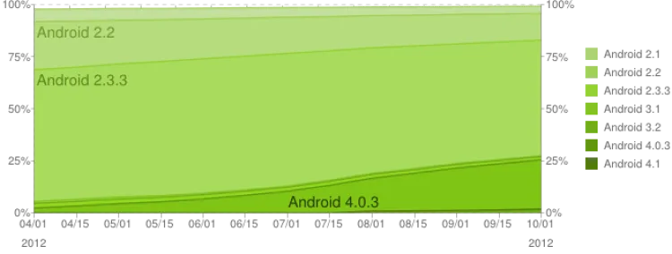 De térjünk vissza a számokhoz: a Google ezúttal is a Google Playre bejelentkező felhasználók adatait vizsgálta, két héten keresztül (az utolsó nap pedig október 1. volt). A minta alapján kirajzolódott, hogy az Android legfrissebb verzióját, az augusztus eleje óta elérhető 4.1-es Jelly Beant csak a felhasználók 1,8 százaléka használja, ami iszonyatosan kevés – csak összehasonlításképpen, az iOS 6-ra a megjelenését követő egy napon belül a készüléktulajdonosok 15 százaléka váltott. A Google-nek sovány vigasz, hogy az Android 4.0 már majdnem a készülékek negyedén fut (23,6% a részesedése ennek a verziónak egészen pontosan). Az adatokból viszont az is nagyon jól látszik, hogy a 2.3-as verzió rengeteg mobil számára volt utolsó fejlesztés, a Google Playre bejelentkezett mobilok 55,8 százalékán még mindit valamelyik 2.3-as verzió fut.