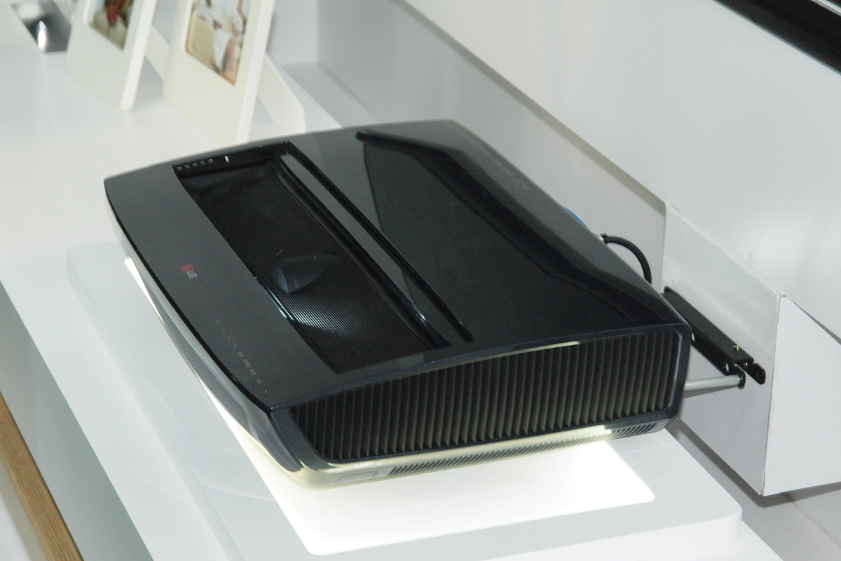 A készülék két egységből áll; egyrészt a projektortól, amelyet az LG azért nevezett el „Laser TV”-nek, mert a vállalat termékpalettáján egy új termékkategóriát képvisel a masina. A projektor érdekessége a lézeres fényforrás, amely fehér fényt állít elő – a működési elv ettől eltekintve teljesen megegyezik a DLP-s projektorok működési elvével. A fókusz és így a vetítési távolság is fix, nem lehet tehát 200 colos képet kicsiholni a Laser TV-ből úgy, hogy kicsit hátrébb visszük a kivetítőt a faltól. A projektor lencséjét finoman persze minden irányban tudjuk állítani, hogy a vetítési egységet pontosan a torzításmentes vetítéshez szükséges irányba tudjuk fordítani.