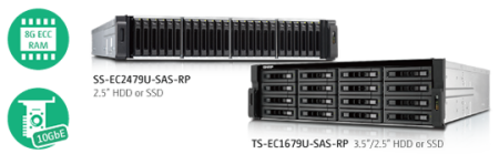 A QNap bejelentette új hálózati adattárait. A TS-EC1679U-SAS-RP és TS-EC1279U-SAS-RP Turbo NAS-ok SAS és SATA 6 Gbps 3,5"-os vagy 2,5"-os merevlemezeket vagy SSD-ket is fogadnak, míg a SS-EC2479U-SAS-RP, SS-EC1879U-SAS-RP és SS-EC1279U-SAS-RP nagy adatsűrűségű NAS-okba 2,5"-os meghajtók építhetők.