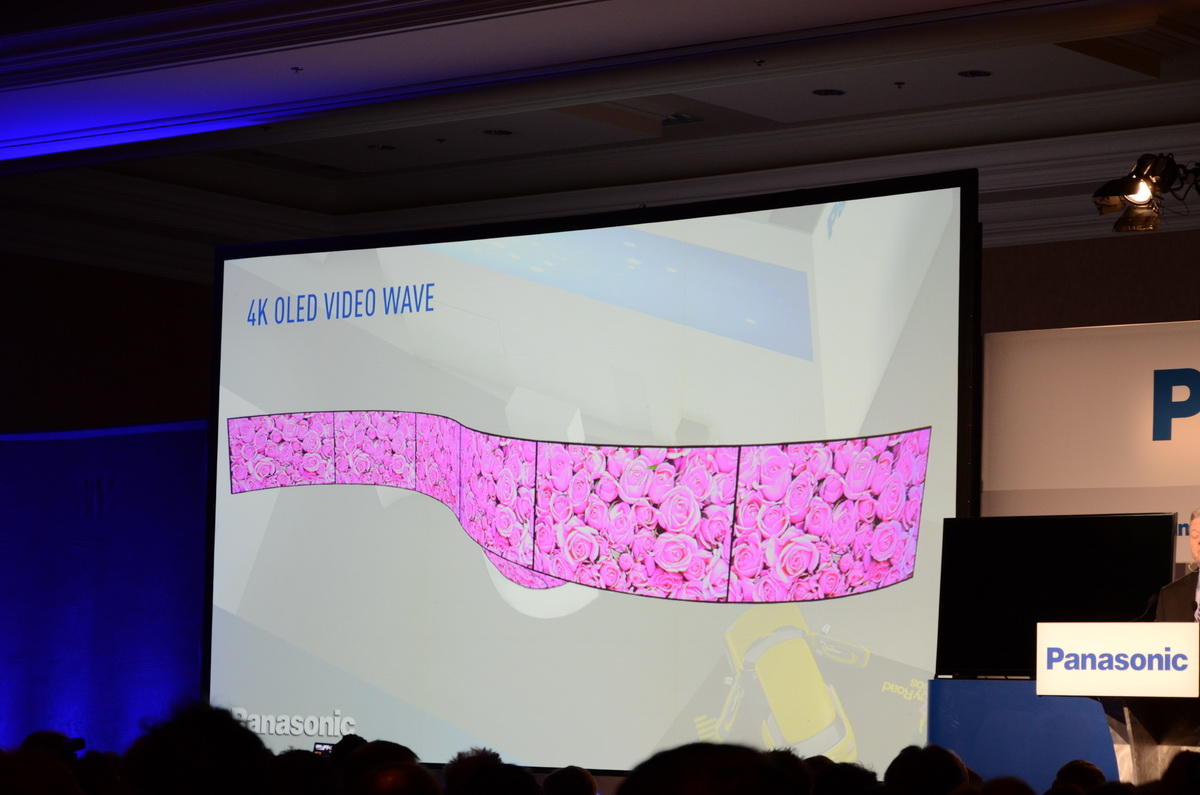 Ezek után kissé váratlanul egy 4K OLED Video Wave fantázianevű OLED-falat kaptunk a kivetítőre, amely ívelt felületű, de nemcsak homorú, hanem domború formákkal is operál. Úgy látszik, hogy a Panasonic vonzódik a különleges kijelzőkhöz, a vállalat korábban plazmára alapozva henger alakú hirdetőtáblát is bemutatott már. A 4K OLED Video Wave természetesen nem otthoni termék, hanem vállalatoknak szánt megoldás, leginkább hirdetőtáblának jó. Ennek ellenére látványos, reméljük, a standon is meg lehet majd nézni.