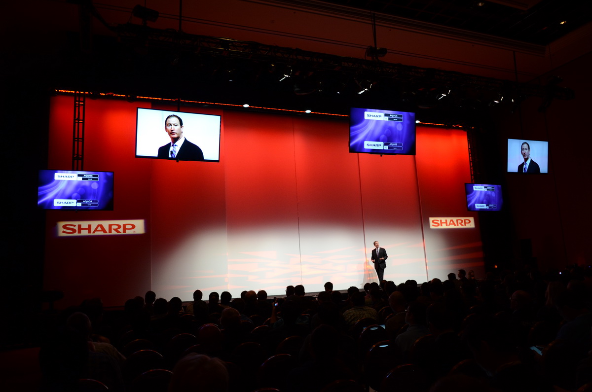 A Sharp nem mindennapi sajtótájékoztatót tartott, kivetítő helyett ugyanis a legújabb tévéken lehetett nyomon követni a vállalat mondandóját. Ami ezúttal nem okozott túl nagy meglepetést, mert már hónapokkal korábban beszámoltunk arról, hogy a japán gyártó nem feltétlenül csak az Ultra HD-ben, hanem a Quattron technológia segítségével felturbózott Full HD tévékben látja a jövőt.