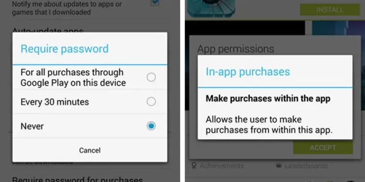 Biztonságosabbá teszi abban az értelemben, hogy mostantól jobban lehet szabályozni, hogy a szoftver mikor kérjen jelszót az alkalmazásvásárlások előtt. Az alapértelmezett beállítás szerint mostantól minden tranzakció előtt be kell gépelni a kódsort (ideális választás, ha kicsik is használják a mobilt/tabletet), aki azonban egyedül használja a készülékét vagy bízik csemetéjében annyira, hogy az nem fog mindent azonnal megvásárolni az Angry Birdshöz, az maradhat a korábbi opciónál is, azaz hogy a jelszó beírása után 30 percig kód nélkül is lehessen vásárolni. A legbátrabbak akár azt is kérhetik, hogy a Play Store sose kérje el a jelszót fizetés előtt. További változás, hogy a telepítés előtt megjelenő biztonsági figyelmeztetés a korábbinál látványosabban adja tudtunkra, ha egy szoftverben olyan vásárlási opció is van, ami nem igényli az alkalmazásból való kilépést.