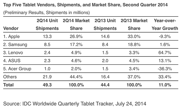Az IDC legutóbbi felméréséből kiderül, hogy az Apple 2014 második üzleti negyedévében (Q2) 16,35 millió darab iPadot adott el – egy évvel korábban még 19,7 millió készülék fogyott ugyanebben az időszakban, tehát a csökkenés óriásinak mondható. Éves szinten a csökkenés 9,3%; az Apple-ön kívül csak az Acer szenvedett el komoly veszteséget (36,3%-os csökkenést).