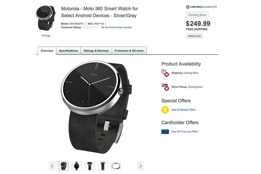 Rövid időre megjelent az amerikai Best Buy hálózat internetes boltjában a Motorola kerek számlapos, Android Wearre épülő okosórája, a Moto 360. A feltüntetett specifikációk között a legérdekesebb talán az ár, amit 250 dollárban jelöltek meg – ez már a második eset, amikor a különlegesnek mondható eszközzel kapcsolatban ennyire kedvező összeget emlegetnek. Az első ugye még akkor történt, amikor az órához kapcsolódó dizájnverseny fődíjaként szerepelt a Moto 360, és az adó miatt szükség volt egy érték feltüntetésére. A Motorola akkor azzal hűtötte le a lelkesedést, hogy az ár még nincs kőbe vésve – ez persze ma is igaz, egészen addig, amíg a hivatalos bejelentés nem történik meg.