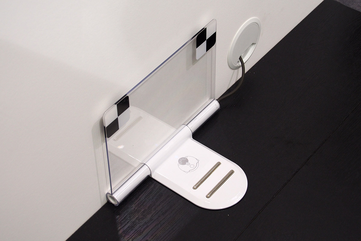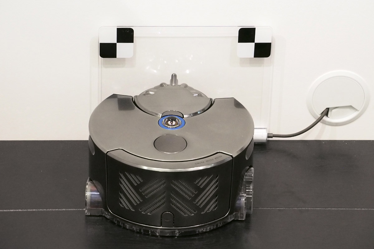 A töltéshez használt dokkoló a legelegánsabb, amivel eddig találkoztunk. A töltés érintkezői a padlóra lefektetett talpba vannak beépítve, de a robot navigálását egy függőleges üveglapra ragasztott kockás matricák segítik. Ezeket nyilván a panorámakamera figyeli.