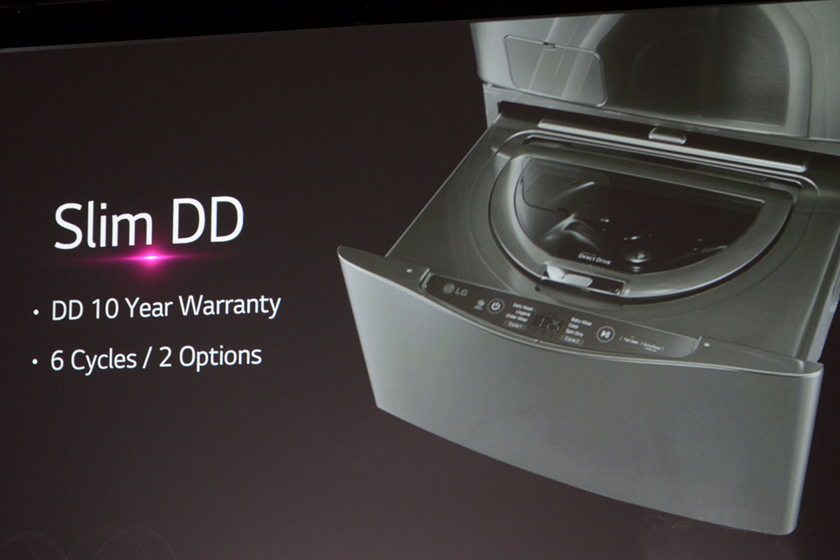 A második etap a fehéráruké volt, amelyekre sok szót nem vesztegetnénk, de a kettő forgódobot tartalmazó, egyszerre két adag ruhával is elbánó Slim DD-ről azért betettünk egy képet. Még ha nem is a legjobbat.