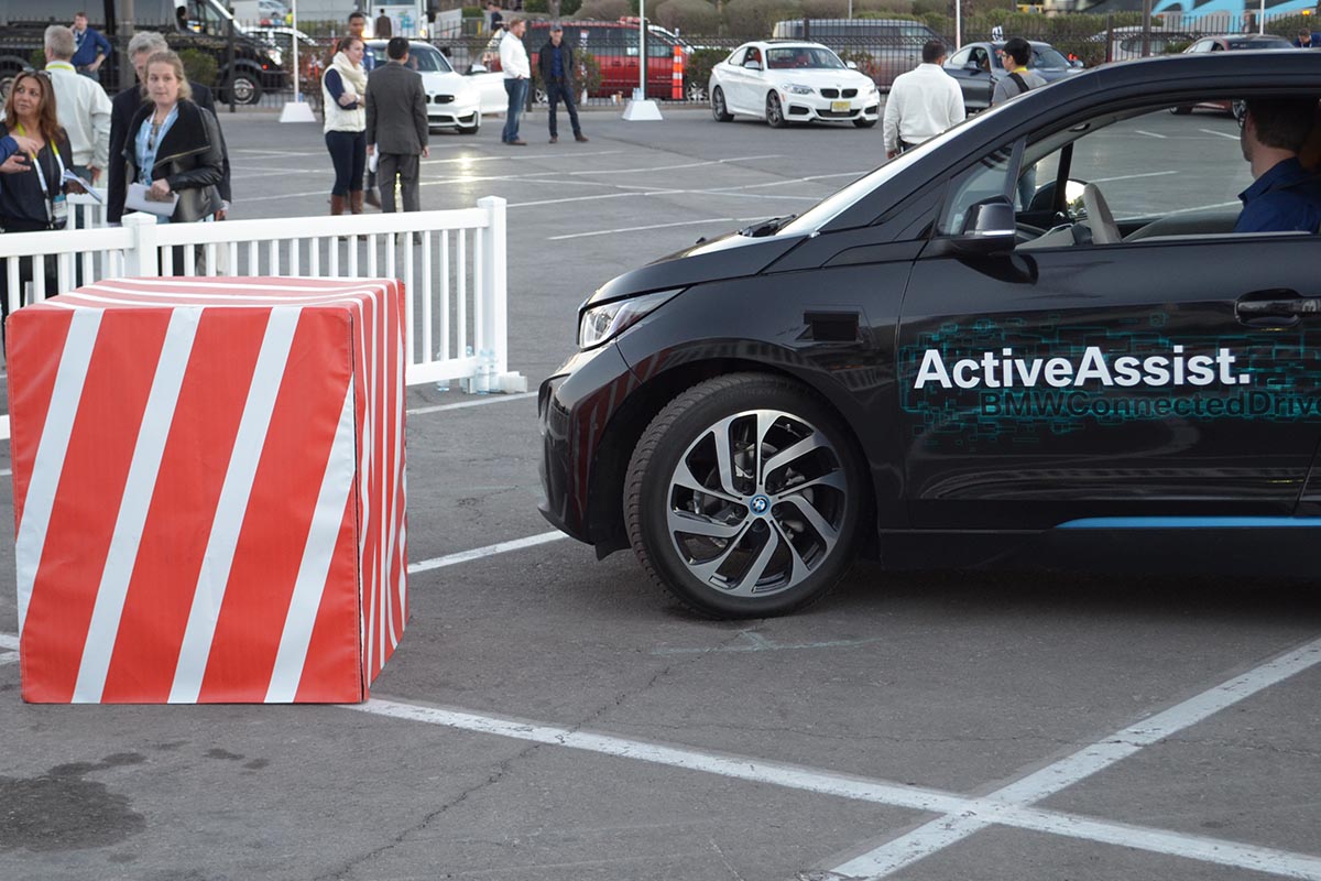 Las Vegasban, egy hotel tetején is tartott bemutatót a BMW, mi viszont már a kiállítási területen ültünk be az i3-ba, amely a vállalat autonóm rendszerét demózta. A rendszer legfőbb elemei az autó elején, hátulján és oldalain elhelyezett lézerszkennerek, valamint a számítógép, ami ezek jeleit feldolgozza. A platform gyakorlatilag megakadályozza, hogy az autó bárminek is nekimenjen. Ezt persze ma az adaptív tempomatok radarja sok autón biztosítja, a BMW rendszere viszont abban különleges, hogy minden olyan közúti elemet megjegyez, amely mellett elhalad – legalábbis egy ideig. Ez arra is alkalmassá teszi, hogy a holttérben lévő nagyobb tárgyak előtt is megálljon, akár előre, akár hátra megy. Ha a rendszer megállítaná az autót a villogó figyelmeztetések közepette, a gázpedál erőteljes lenyomásával felülbírálható. Az oldalsó szenzorokkal pedig még arra is ügyel, hogy a parkolóhelyre való beálláskor még véletlenül se törjük le a tükröt.