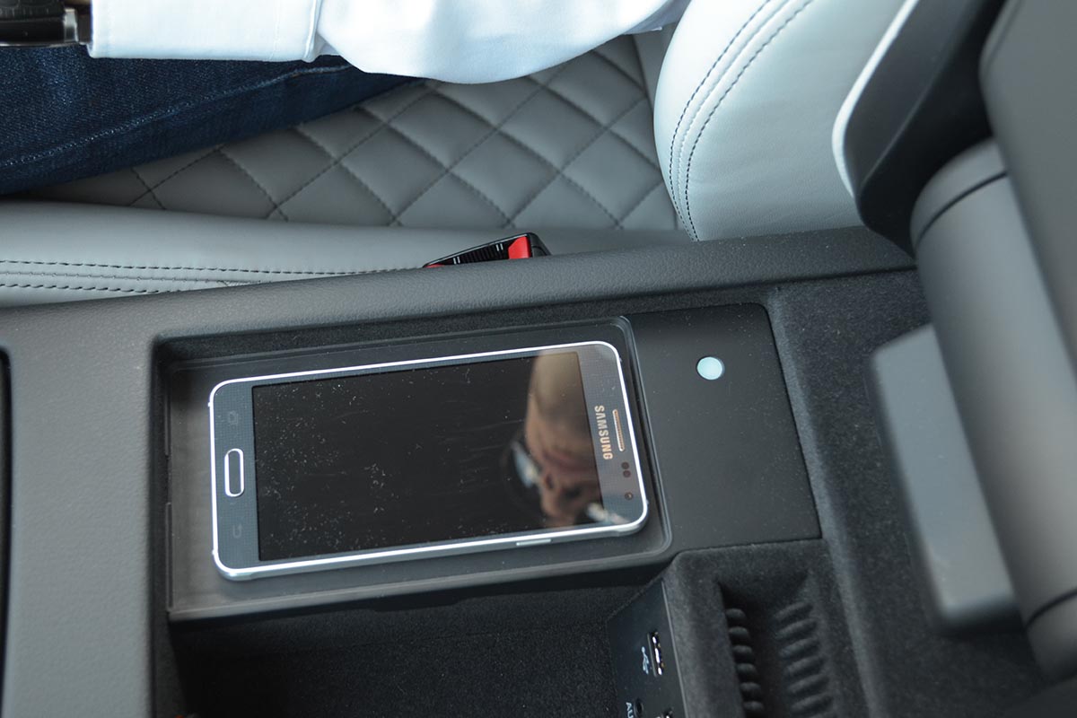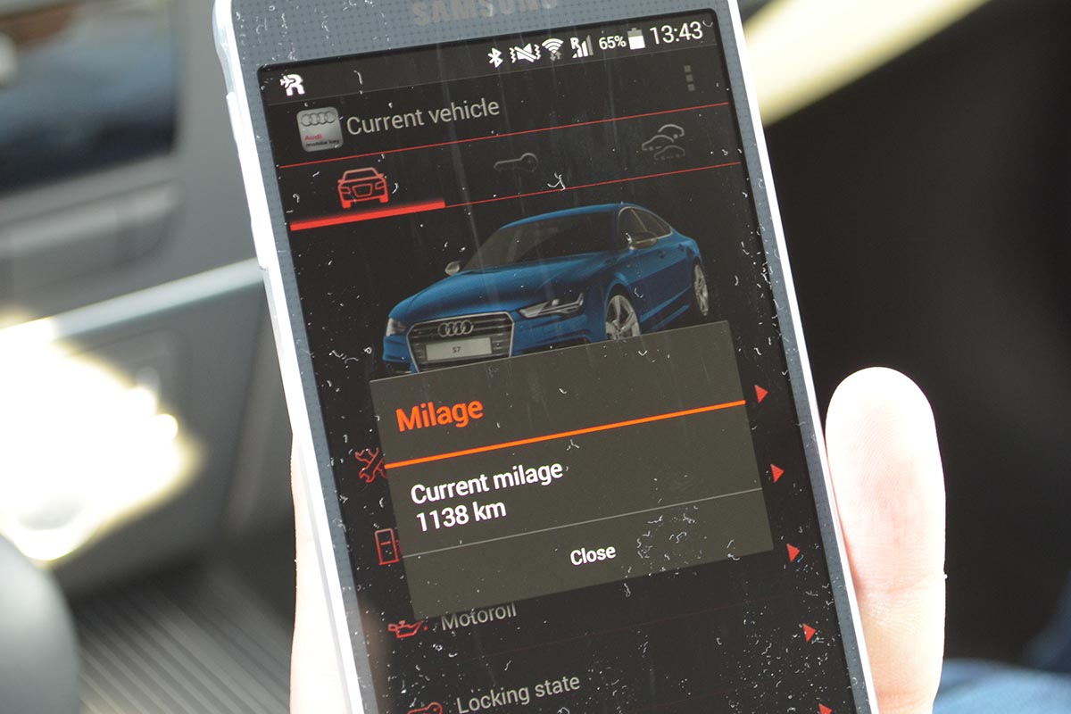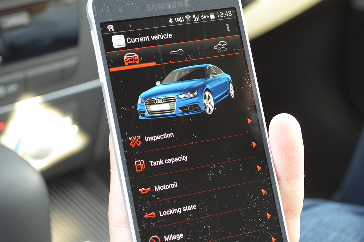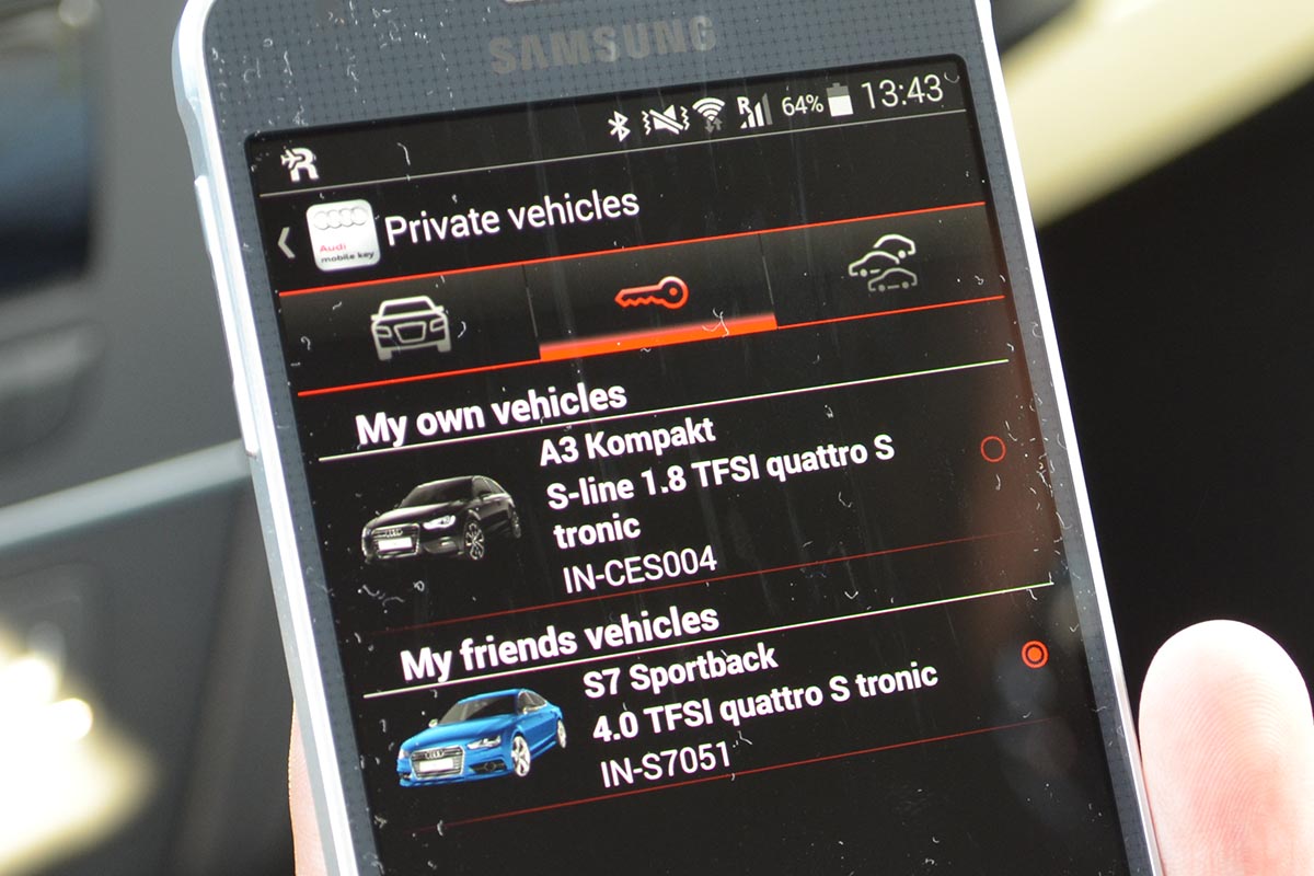 Ezután a jármű beindításához a középkonzolon lévő felületre kell helyezni a mobilt: néhány másodperc alatt megtörténik az azonosítás, és már indulhat is a kocsi. Az NFC előnye, hogy sokkal rugalmasabb kezelhetőséget ad. Ha például a férj egy üzleti úton van, és véletlenül elvitte a kocsi kulcsát, egyszerűen adhat jogosultságot az otthon maradt feleség számára – akár úgy beállítva is, hogy az engedély csak egy napig legyen érvényes. A jogokat az autó a felhőben kezeli, és természetesen nemcsak az Audi alkalmazásával lehet őket módosítani vagy visszavonni, hanem akár interneten is (myAudi) – ez praktikus mondjuk akkor, ha a tulajdonos elhagyja a telefonját.