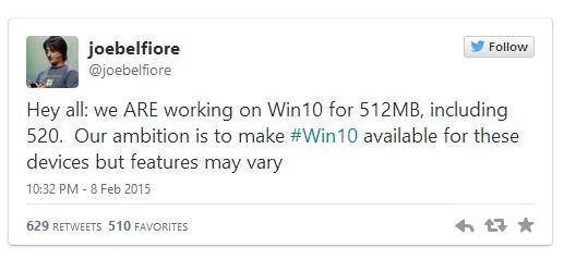 Ez az ígéret pedig nem mástól, mint Joe Belfiore-tól, a cég operációs rendszerekért felelős alelnökétől származik, aki a Twitteren tette közzé, hogy javában dolgoznak a Win10 egy olyan változatán, ami az 512 MB RAM-mal rendelkező készülékeken, így például a Lumia 520-on is futtatható lesz.
