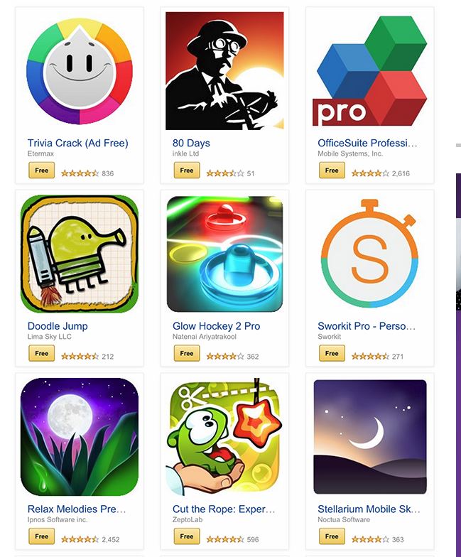Az Amazon elsősorban a Fire cuccok kedvéért vágott bele az androidos alkalmazásokkal való foglalkozásba, és így saját alkalmazásbolttal is rendelkezik, Amazon Appstore néven. Ennek egyik érdekessége, hogy minden héten más és más, amúgy fizetős alkalmazást lehet ingyen telepíteni, illetve jelesebb ünnepekkor hajlamosak egész komoly kedvezményekkel előrukkolni.