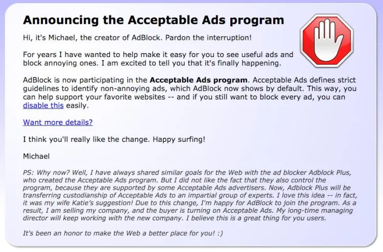 Az eladással párhuzamosan, már az új tulajdonos kérésére jelent meg az az üzenet, amivel a kiegészítőt használók a múlt héten szembesülhettek: ebben arról tudósított a program, hogy mostantól részt vesz az Acceptable Ads programban, ami gyakorlatilag arról szól, hogy a szolgáltatásért fizető hirdetőket a szűrő át fogja engedni. Jelen pillanatban ez még letiltható, de ehhez a beállítások menüben kell kotorászni, az alapértelmezés szerint az AA kínálta whitelist aktív.