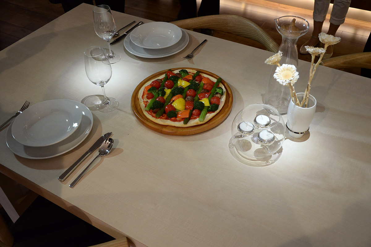 Visszatérő elem volt a Panasonic CEATEC-es standján és a Tokió mellett lévő Panasonic Centerben is az a koncepció, amely a spotlámpát projektorra cserélte. Az elgondolás szerint a módszer azért nagyon jó, mert így csak oda kerül fény, ahova kell (más kérdés, hogy a kitakarást tükrök végzik, tehát sok lesz a veszteség), ráadásul a világításra egy sor extra feladatot is rá lehet bízni. Mondjuk azt, hogy a hangulatnak megfelelően más színnel vagy halványabban világítson, de természetesen a projektor tud képet vetíteni az asztalra is.
