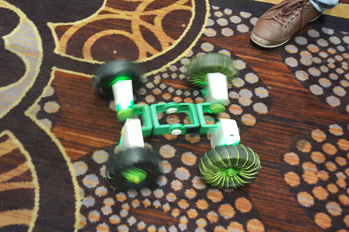 Mármint a kézzel való irányítás természetesen áll, de az hogy ez a robot lenne az első, amelyet a kézmozgással lehet vezérelni, az biztosan nem igaz. Hogy csak egy dolgot említsünk, a Sphero a CES előtt nem sokkal demózta új kütyüjét, amit nem telefonnal, hanem a csuklóra erősített, mozgásérzékelővel felszerelt óra segítségével lehet magunkhoz édesgetni. De térjünk vissza Zirora, mert a csúsztatás ellenére azért érdekes kütyüről van szó. A robot moduláris felépítésű, így mindenki olyan járgány épít belőle magának, amilyet csak szeretne. Összeszerelése nem túl nehéz, mivel tépőzárakat kell csupán egymáshoz illeszteni – annak ellenére, hogy ez nem hangzik bíztatóan, a robot a CES-en csak akkor esett szét, amikor a figyelmetlen látogatók felrúgták, ilyenkor pedig még jól is jött, hogy a tépőzár el tudott engedni. A demóhoz használt jármű négy kereket és az azokat összekötő elemeket tartalmazta csupán; a meghajtást a kerekekben lévő apró elektromos motorok biztosítják.