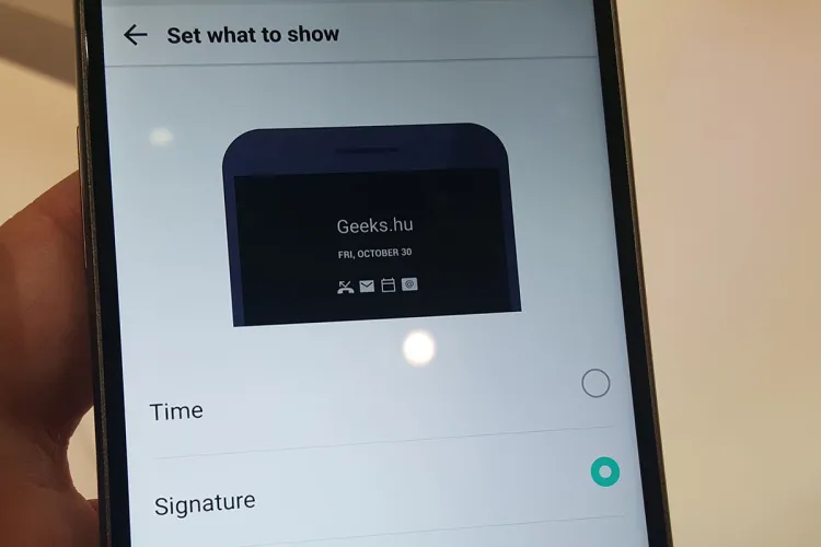 Az LG-nél alapesetben a dátum és az idő valamint az értesítési tárhelyen megjelenő négy legutolsó ikon látszik, de az órát lecserélhetjük tetszőleges szövegre – aminek szerintünk leginkább csak akkor van értelme, ha mindenkinek LG G5-je van otthon vagy a cégnél, mert így könnyebb megkülönböztetni a telefonokat egymástól. Az LG-nél a funkcionalitás egyelőre elmarad tehát attól, mint amit a Samsung kínál ezen a téren (viszont szoftveres megoldásról van szó, így ezt a dolgot könnyű lesz behozni), cserébe viszont a fogyasztás jóval kedvezőbb, mivel a G5 eleve kisebb akkumulátorából is óránként csak 0,8 százaléknyit igényel.