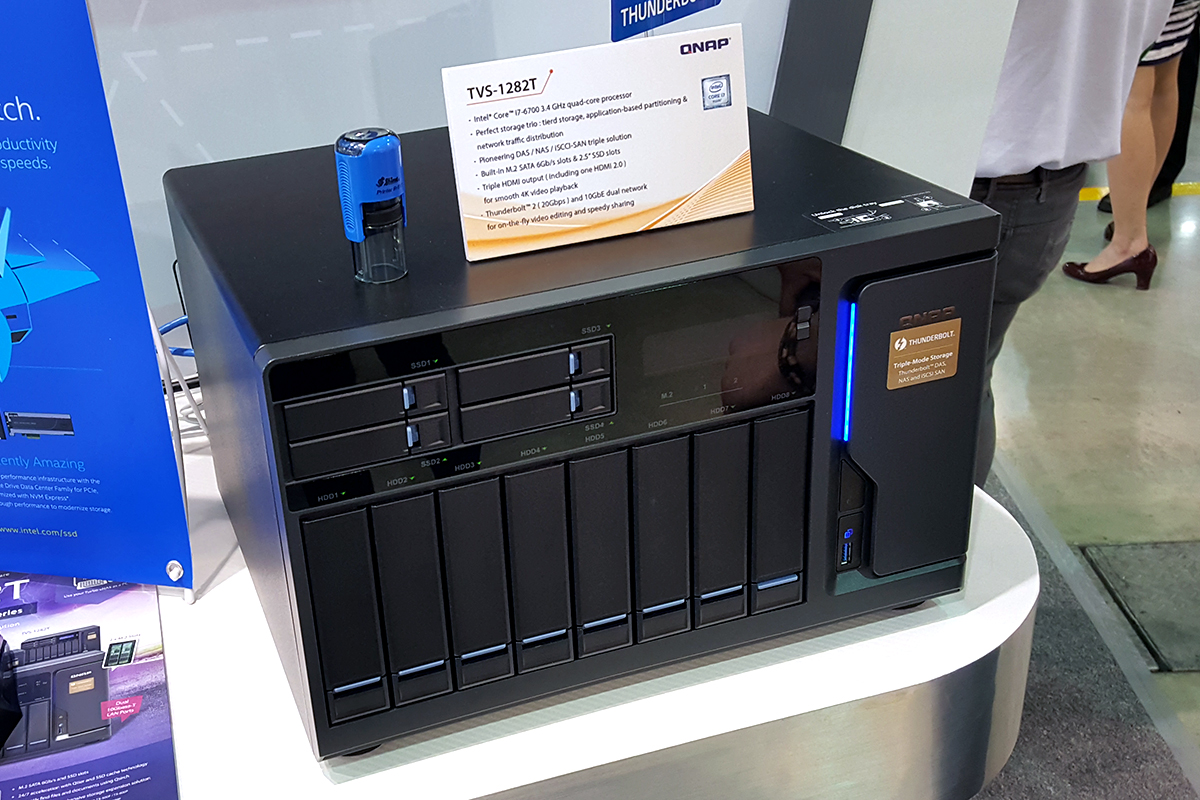 A NAS-ok kezdetben még csak adattárolási célokat szolgáltak, ma viszont már egy sor extra szolgáltatást nyújtanak, a legprofibb megoldások például arra is képesek, hogy virtuális gépeket futtassanak. A QNAP TVS-x82T szériája is ilyen, amely ráadásul párhuzamosan akár több virtuális PC-t is tud futtatni; lelkét hatodik generációs Core i3/i5/i7 processzor adja, a kommunikációt pedig a merevlemezek mellé beépített M.2-es SSD (mint cache) illetve a két 10 Gbites LAN port teszi villámgyorssá. A szériát a QNAP márciusban, a Cebiten jelentette be, de mivel még mindig nem kapható belőle egyik változat sem, továbbra is újdonságnak számít. A TVS-x82T sorozatban tartozó modellek erejét kiválóan jelzi, hogy a rajtuk futó virtuális gép akár az Intel Vive-ot is zökkenőmentesen „viszi” – ezt a standon ki is tudtuk próbálni, és tényleg semmivel sem volt gyengébb a vizuális élmény, mint amikor a Vive „rendes” gépen futott.