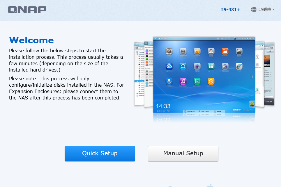 Miután csatlakoztattuk a NAS-t a hálózathoz, be kell állítanunk a működéshez szükséges legfontosabb paramétereket. Ehhez a QNAP TS-431+ esetében is be kell lépnünk a webes kezelőfelületre, amit a készülék IP-címének ismeretében böngészővel, egyébként pedig a QNAP QFinder PRO alkalmazás segítségével tehetünk meg. Ha a hálózatban egynél több router vagy switch található, mindenképpen ajánlott a szoftveres segítséget igénybe venni; az alkalmazással nemcsak megkereshetjük a NAS-t, hanem a firmware-t is frissíthetjük.