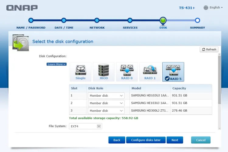 Ami nyilván nem jelenti azt, hogy kisebb-nagyobb különbségek nincsenek; a TS-228 és a TS-431+ is kiváló példa erre, hiszen bár mindkettőt ugyanabba a kategóriába sorolja a QNAP, a támogatott RAID módok listája elég szép eltérést mutat. Ez legnagyobb részben persze annak köszönhető, hogy mostani tesztünk alanya 4 HDD-t kezel, míg a TS-228-ba csak kettő merevlemezt lehet beszerelni. A single, JBOD, RAID 0 és RAID 1 üzemmódok mellett támogatja a RAID 10, RAID 5, RAID 5 + spare illetve RAID 6 üzemmódokat is. Bármilyen kötetet is választunk, a hardveres titkosítás lehetősége is adott, így az adataink akkor is biztonságban lesznek, ha a merevlemezeket esetleg ellopják.