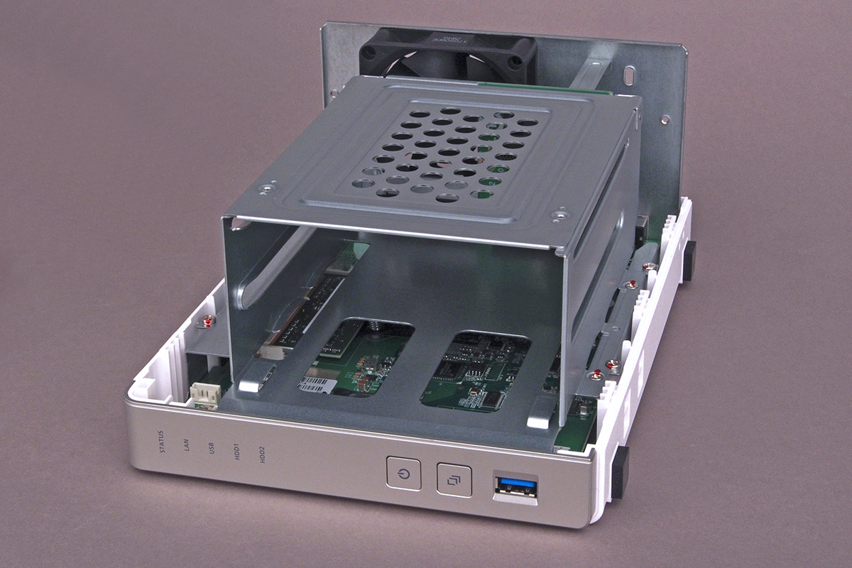 A QNAP TS-232P2-t szerencsére a garancia elveszítése nélkül is szét lehet szedni; erre nem a merevlemezek beépítése miatt lehet szükség, hanem akkor, ha a ventilátort szeretnék esetleg kicserélni – de erről később. Visszatérve a merevlemezekre, a HDD-ket elölről lehet beszerelni, mégpedig úgy, hogy a fiókokat egyszerűen csak ki kell húzni, és a meghajtókat a rögzítési pontok segítségével a fiókhoz kell erősíteni. Furatok nemcsak 3,5 colos HDD-khez vannak, hanem 2,5 colos meghajtókhoz is – praktikusan ezekre akkor lesz szükség, ha az 2,5 colos HDD-ket vagy SSD-ket használunk. A csavarozást nem lehet megspórolni, de ennél nagyobb bajunk ne legyen. A tálcák műanyagból készültek, és nincsen rajtuk olyan gumibetét, ami a rezgéseket el tudná nyelni; ennek ellenére 5400 rpm-es meghajtókkal nem kell aggódni a vibráció miatt.